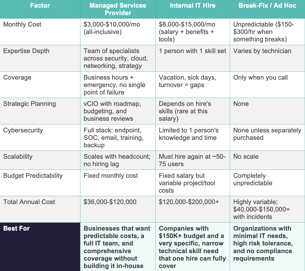 The internal hire comparison is worth examining closely, because it's the question we hear the most. I've watched companies invest $150,000 in an internal IT person and still call us 6 months later because that person couldn't keep up with security, strategy, help desk, and network management at the same time. It's not a talent problem. It's a math problem. An IT generalist capable of handling day-to-day support costs $80,000-$120,000 in salary alone. Add benefits (30-40%), tools and licensing ($15,000-$30,000/year), training ($3,000-$5,000/year), and the fact that one person can't cover security, strategy, networking, and help desk simultaneously, and the true total cost of ownership lands between $120,000 and $200,000 annually for a single employee.