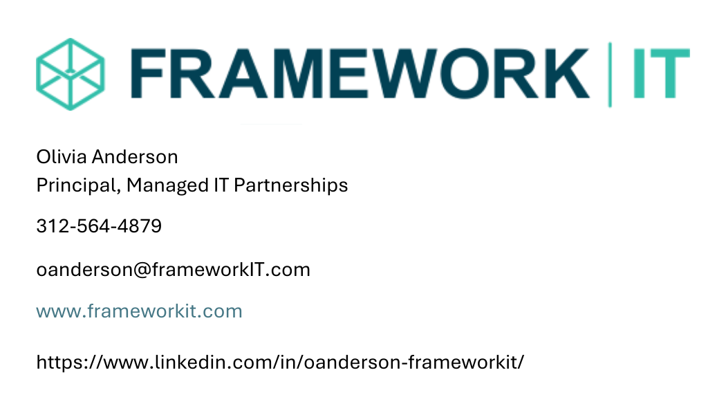 In advance of your Teams video meeting with Olivia, our Principal, Managed IT Partnerships, I'm enclosing more information about Framework IT and how we help business leaders like you eliminate the frustrations and complexities of IT.